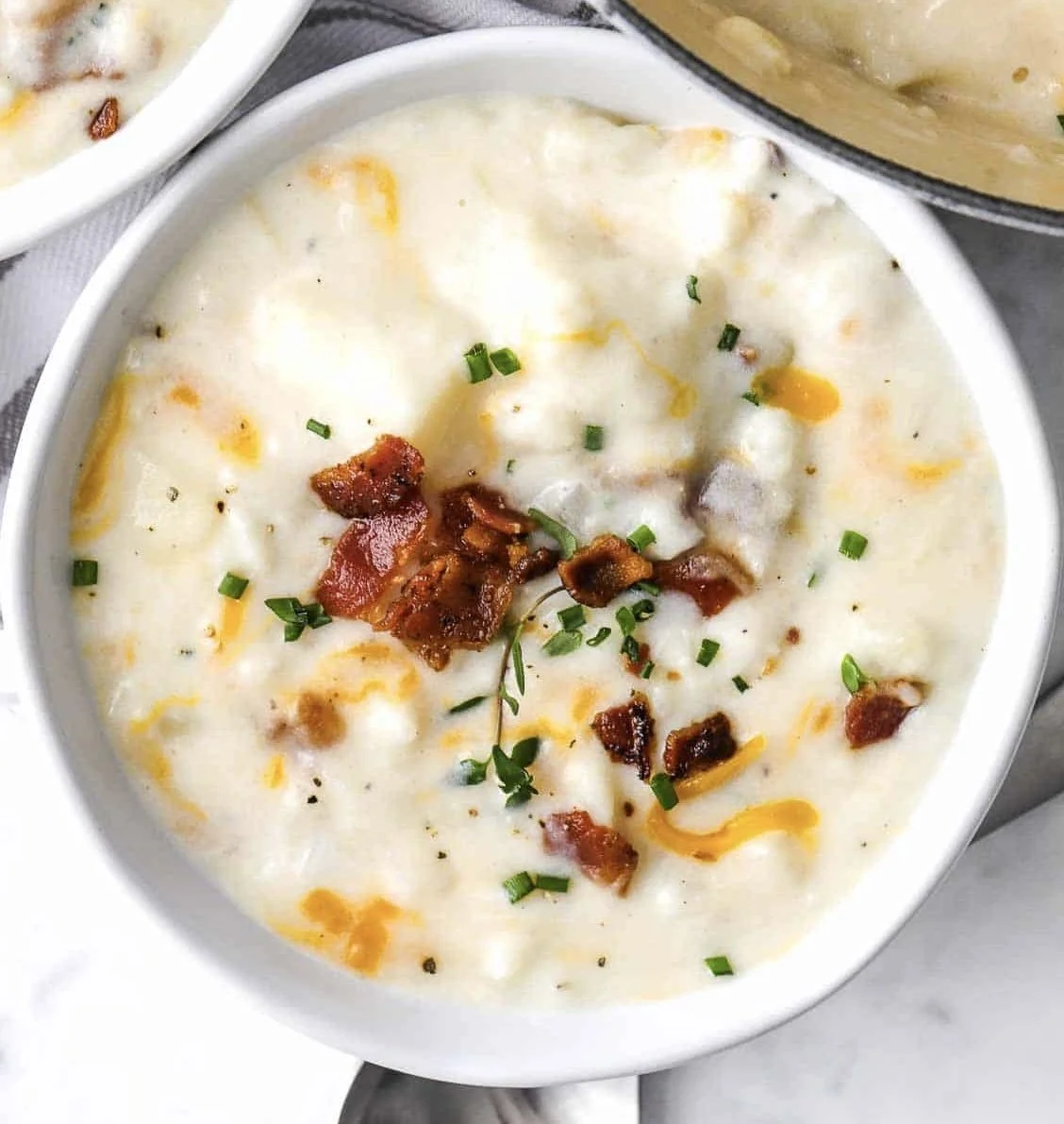Creamy Potato Soup topped with cheddar jack cheese, bacon and scallions