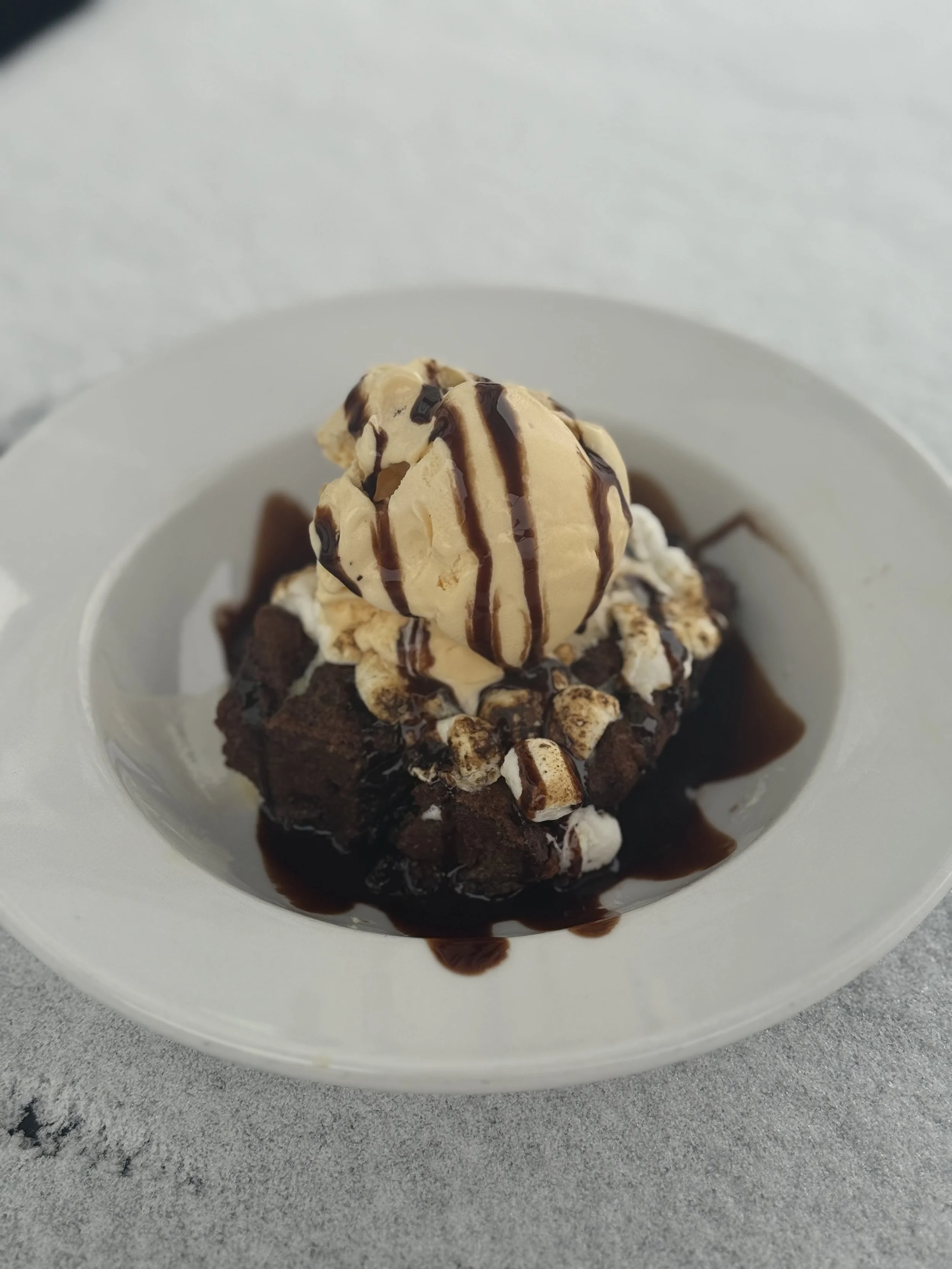 Chocolate bread pudding topped with toasted marshmallows, ice cream and chocolate drizzle