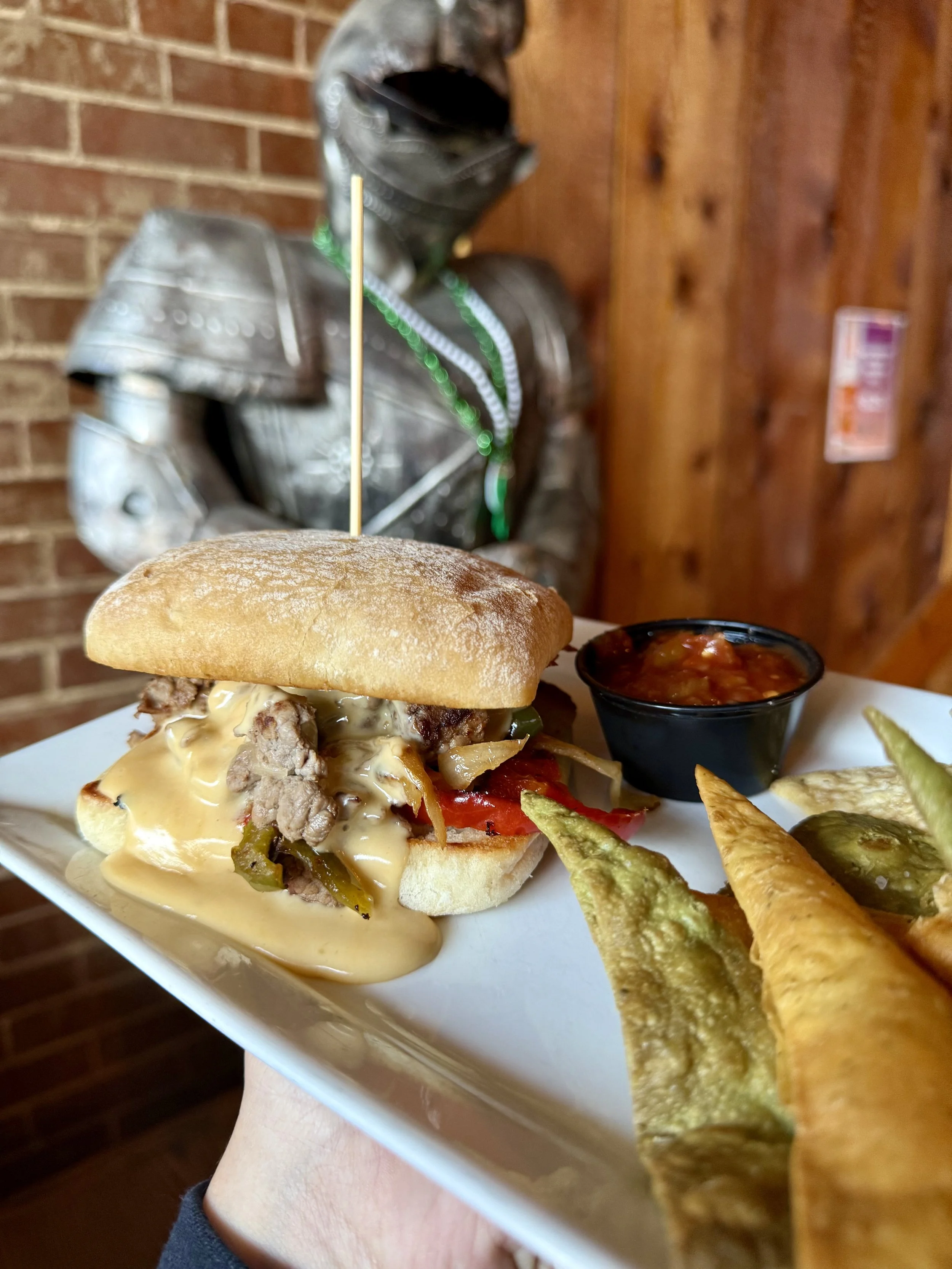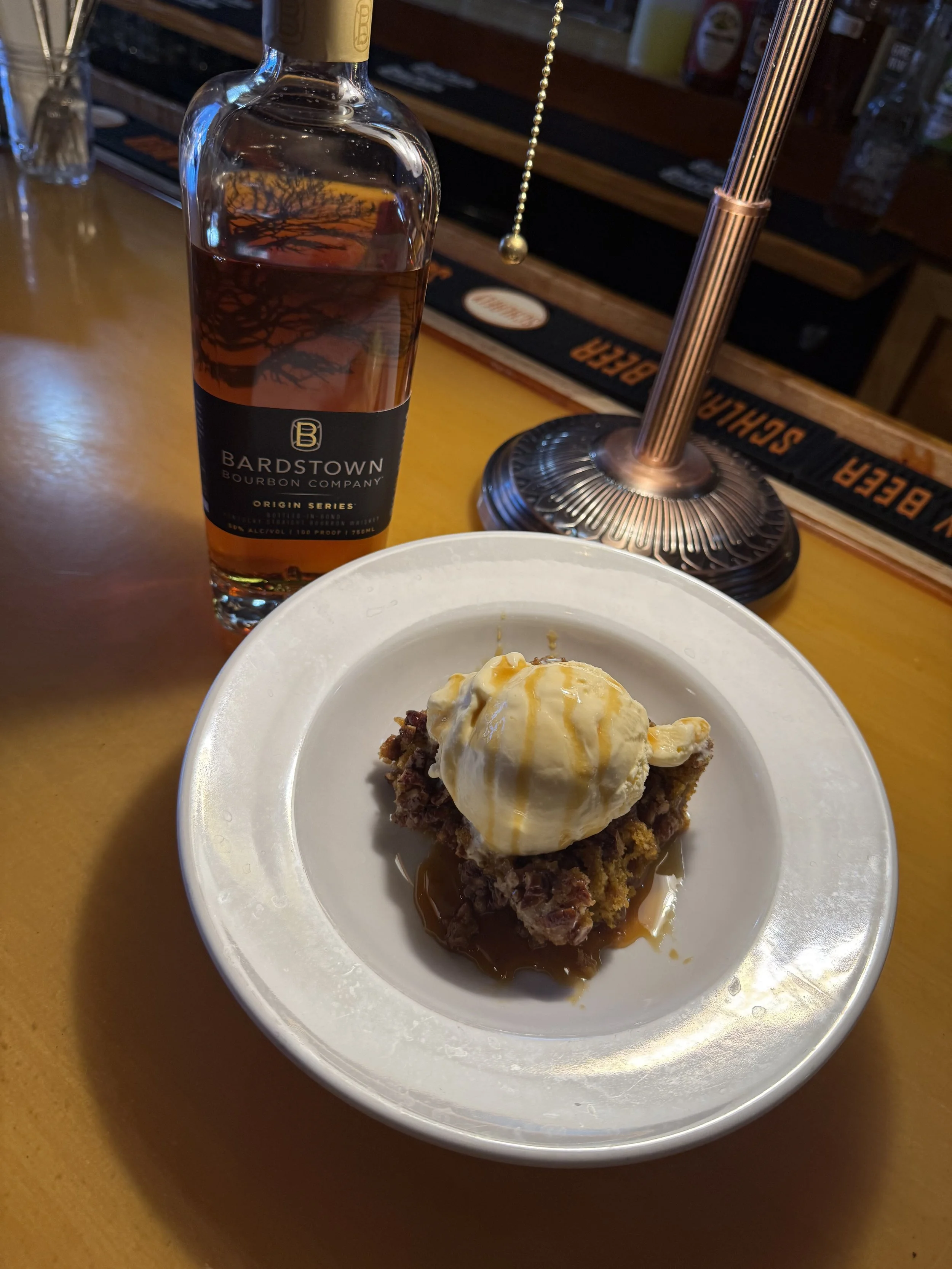 Warm Pumpkin Pecan Cobbler: served with vanilla ice cream and caramel drizzle