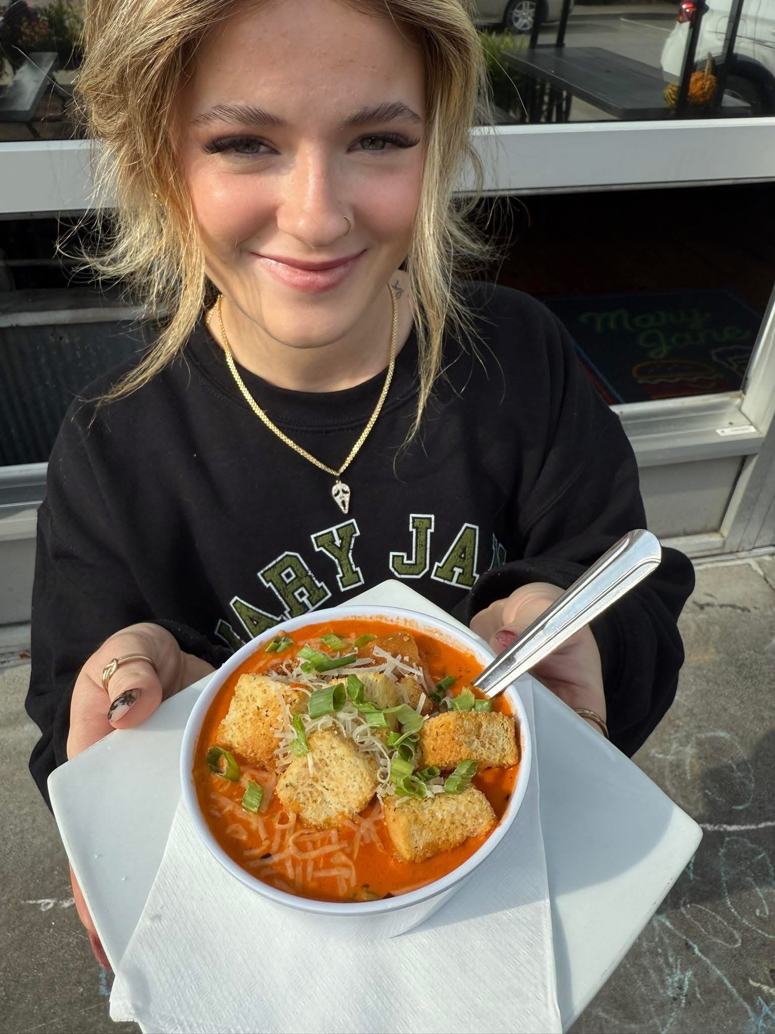 Roasted Red Pepper and Gouda soup topped with parmesan cheese, croutons and scallions